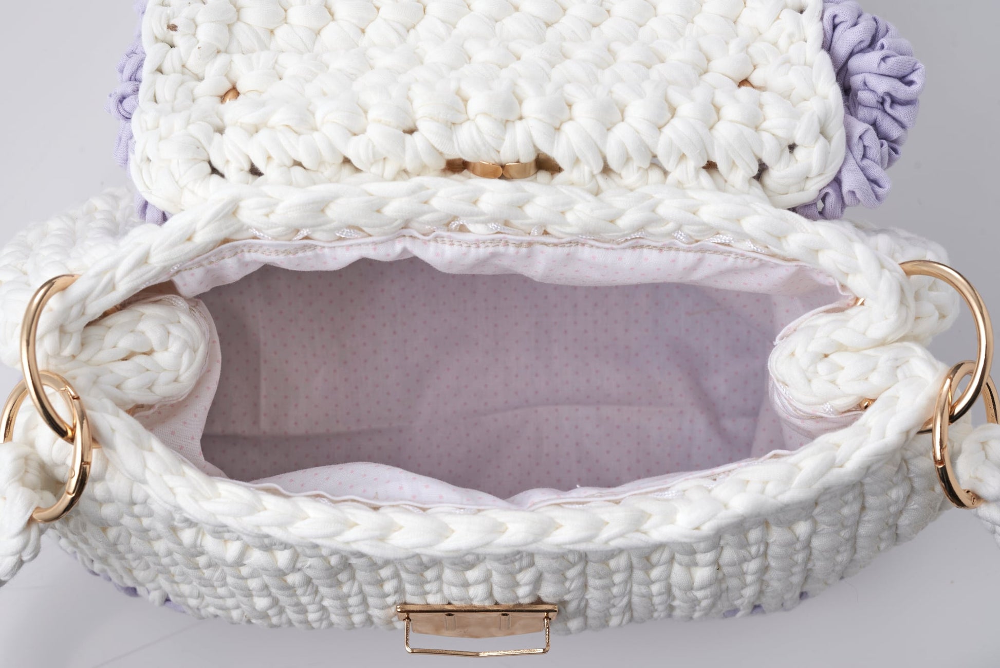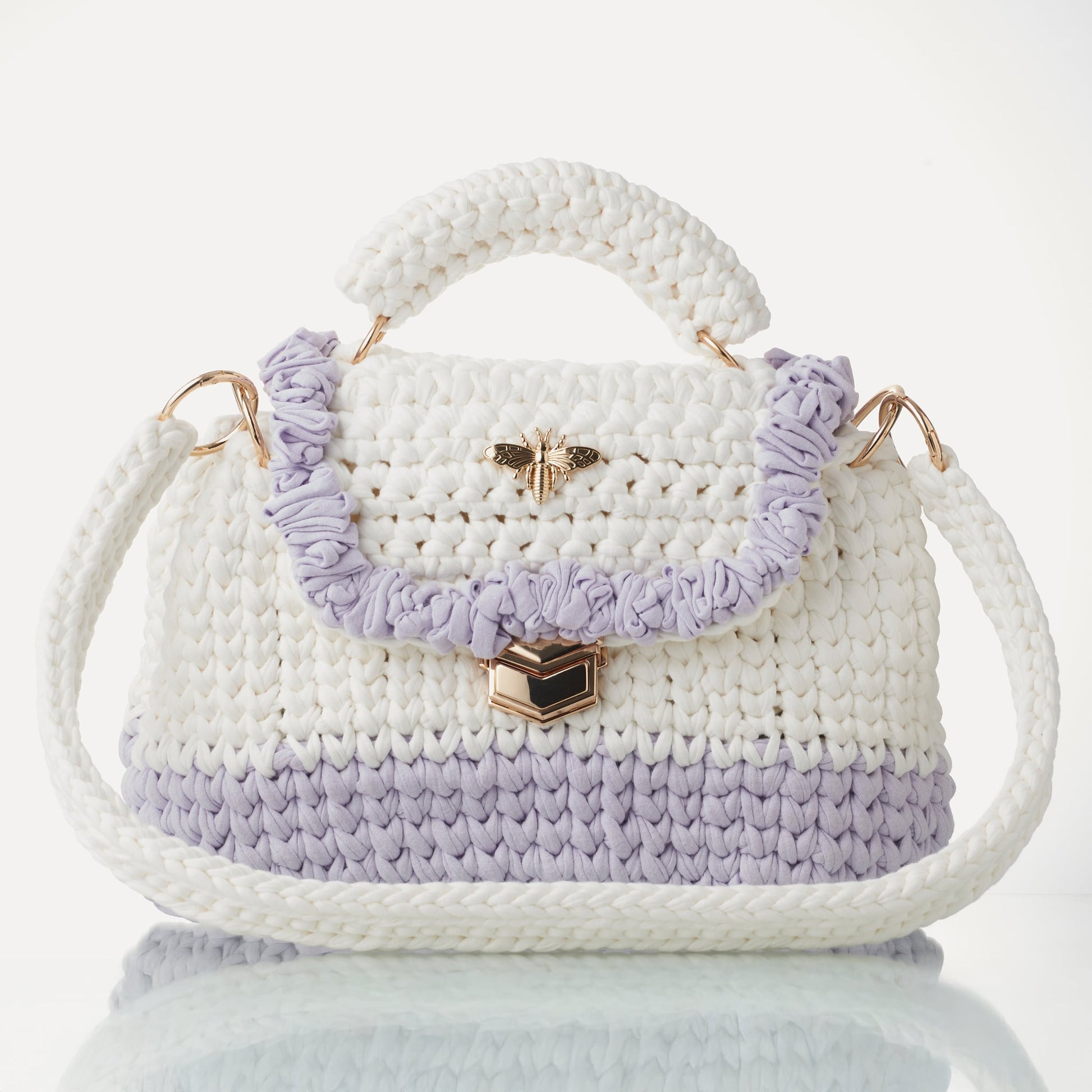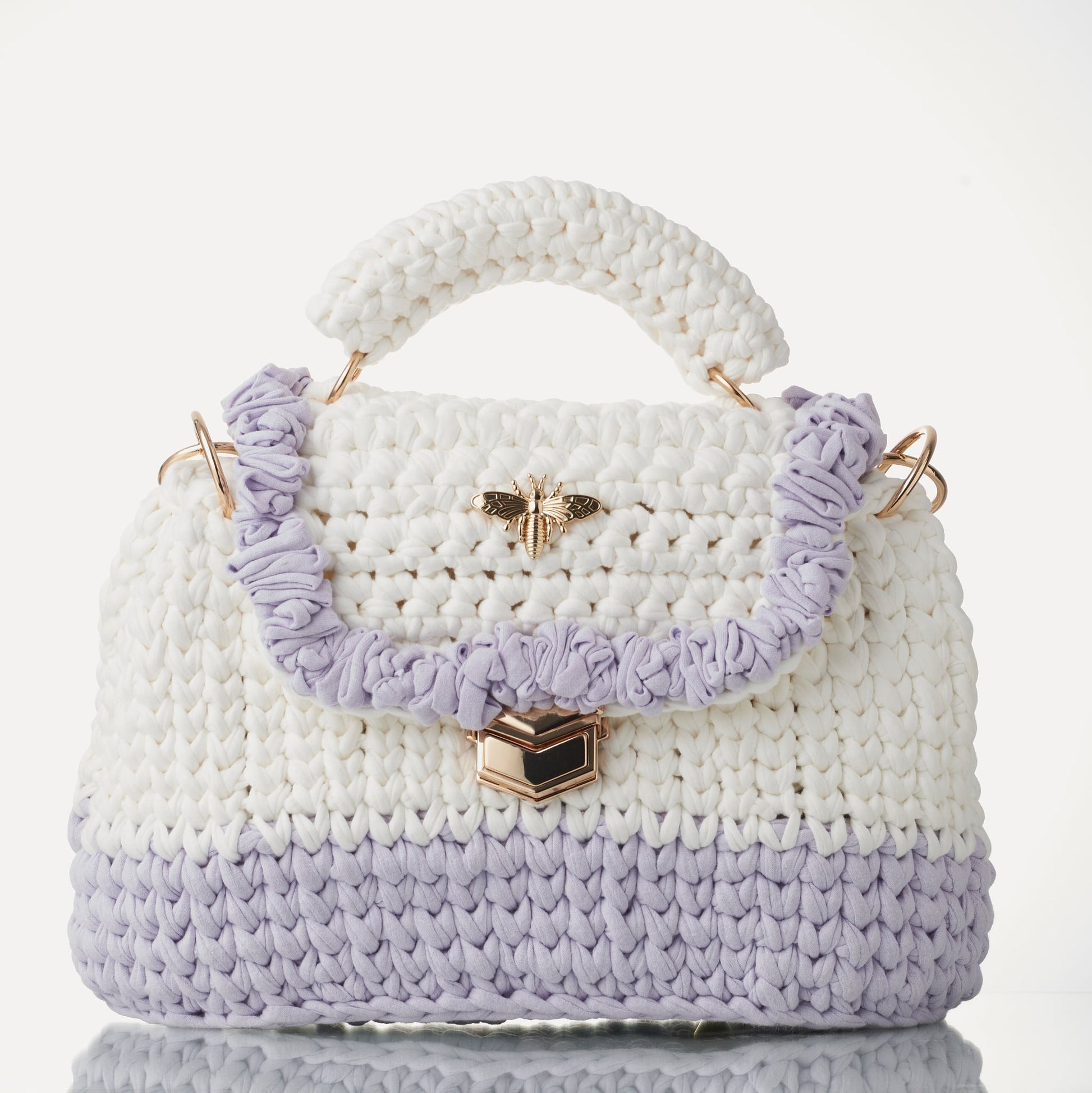 Le modèle Asteria, né de la douceur des mailles crochetées, avec l'éclat du blanc et la tendresse de la lavande.