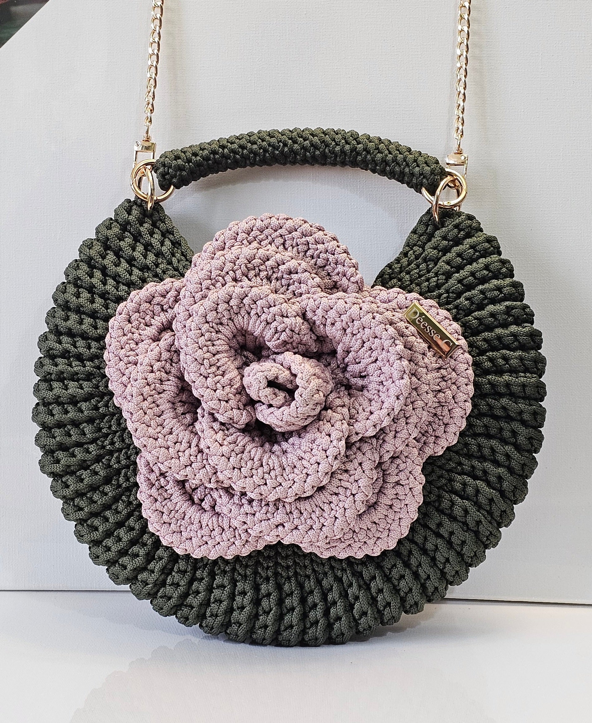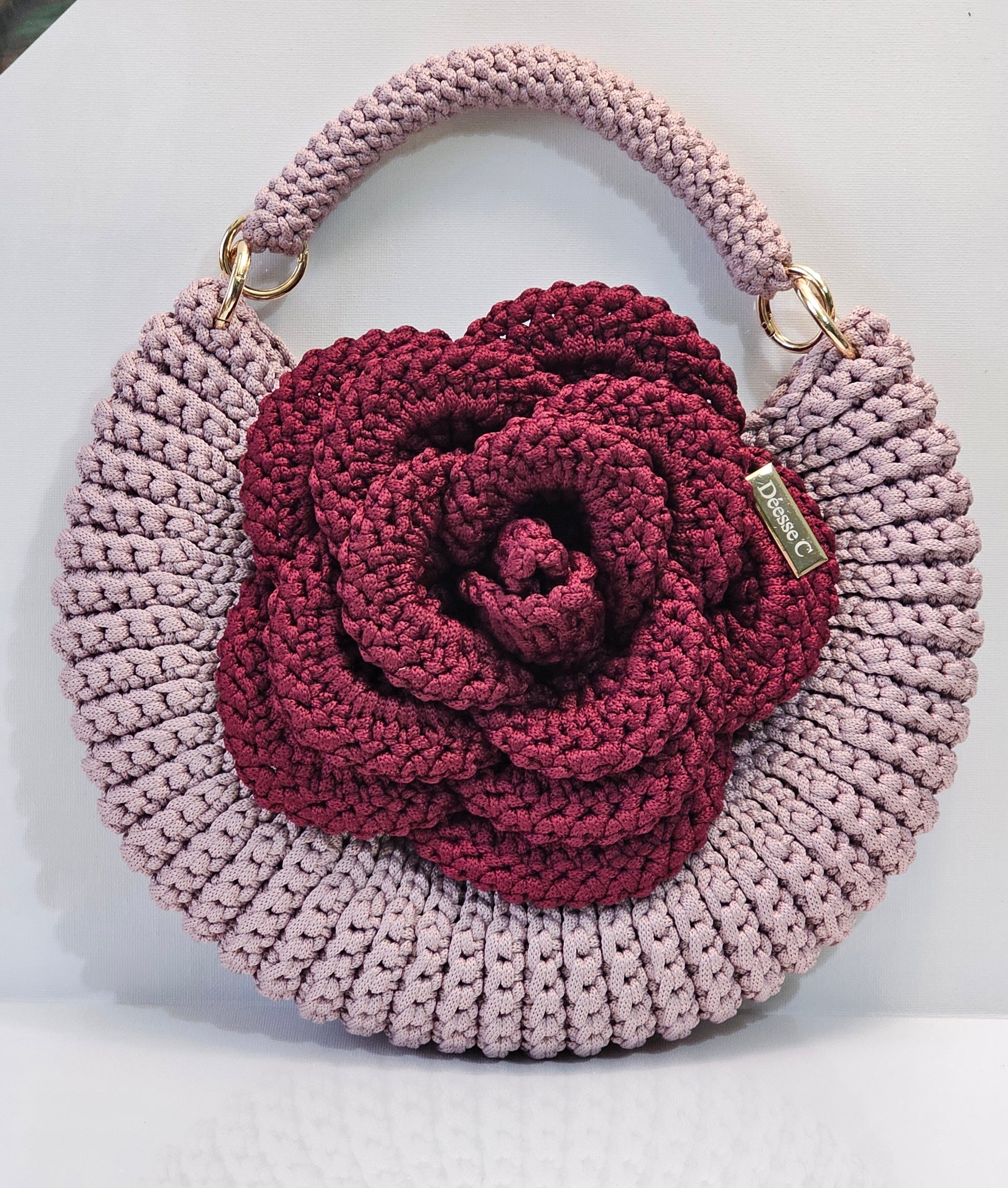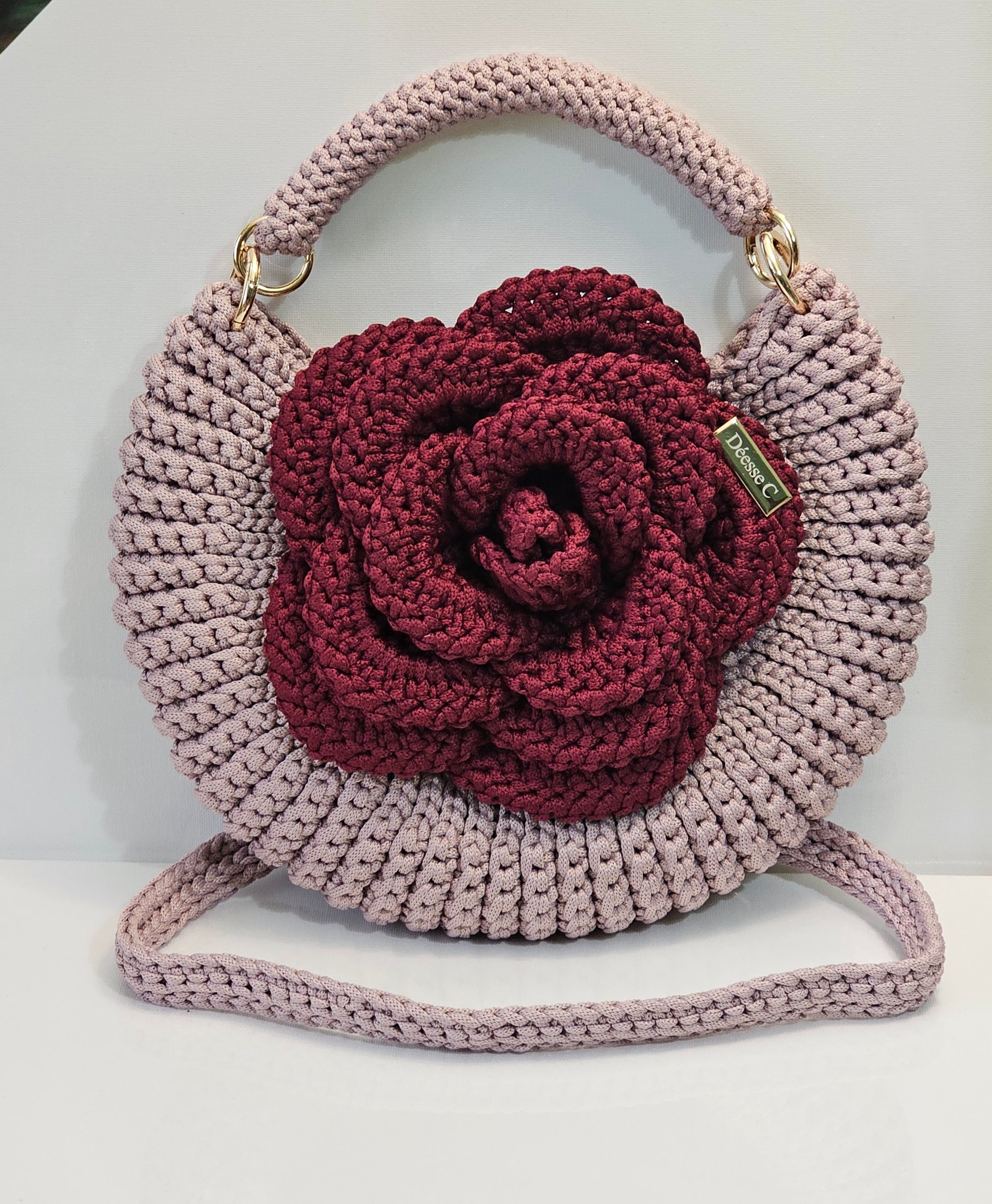 Le modèle Astraéa, est un sac crocheté à la main, façonné en demi-lune et orné d'une rose majestueuse qui en fait sa signature.