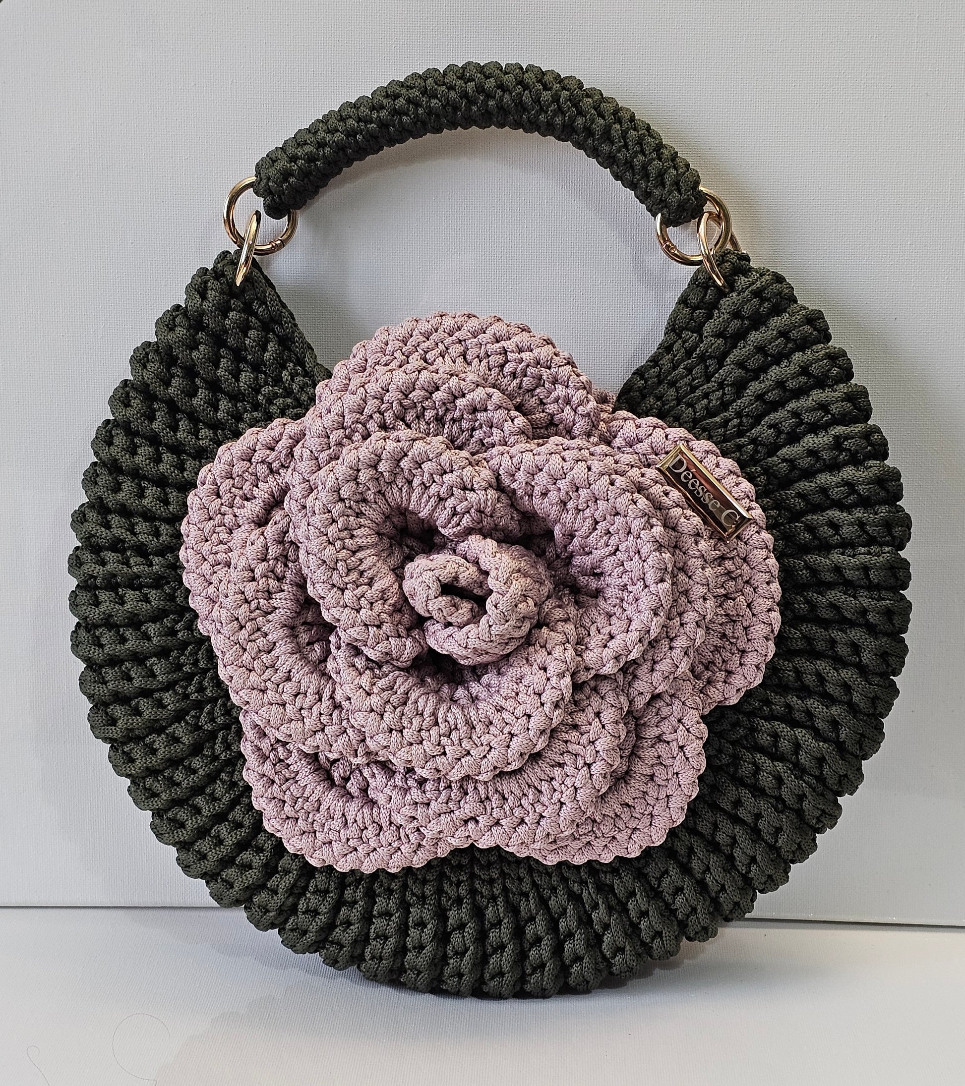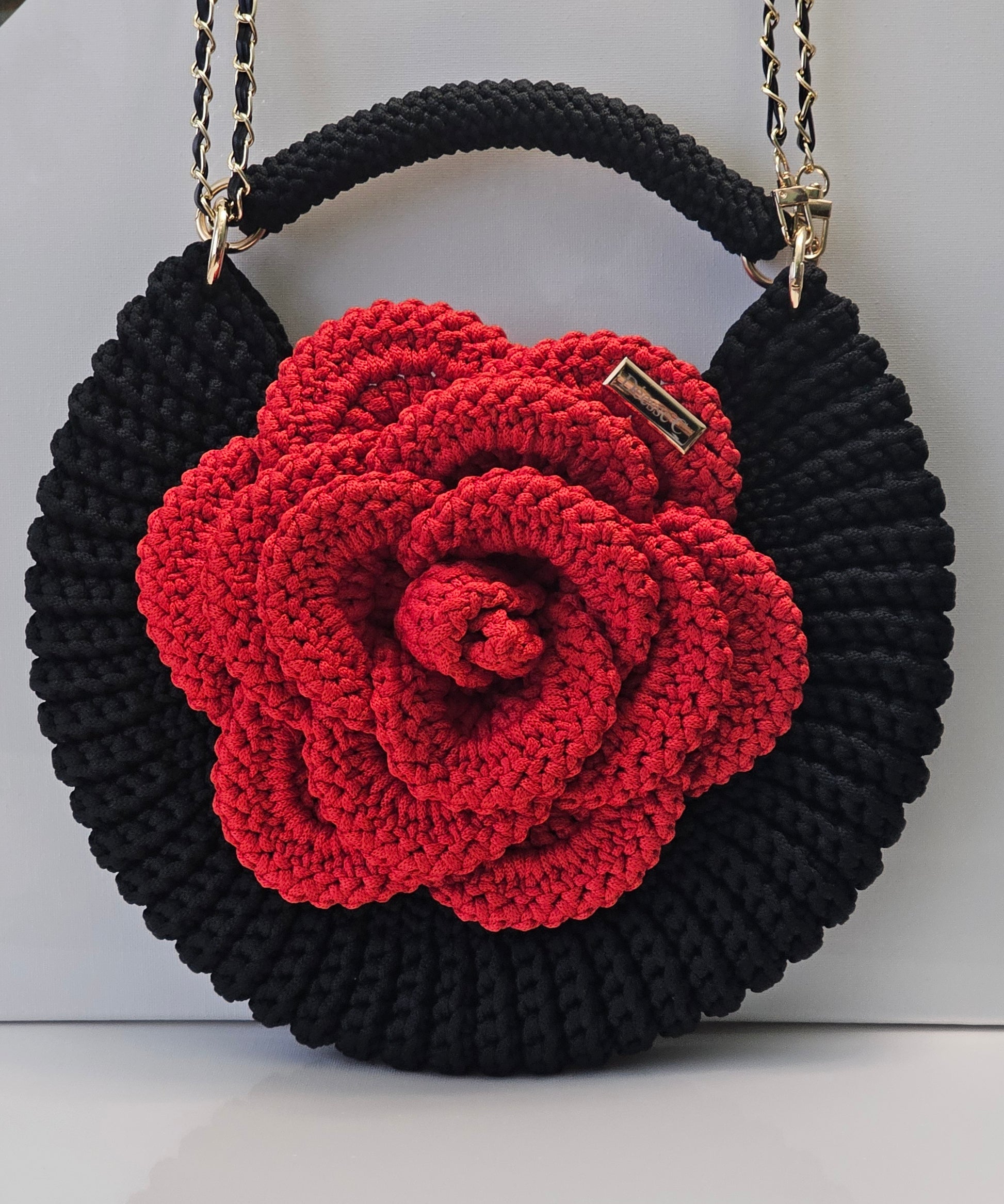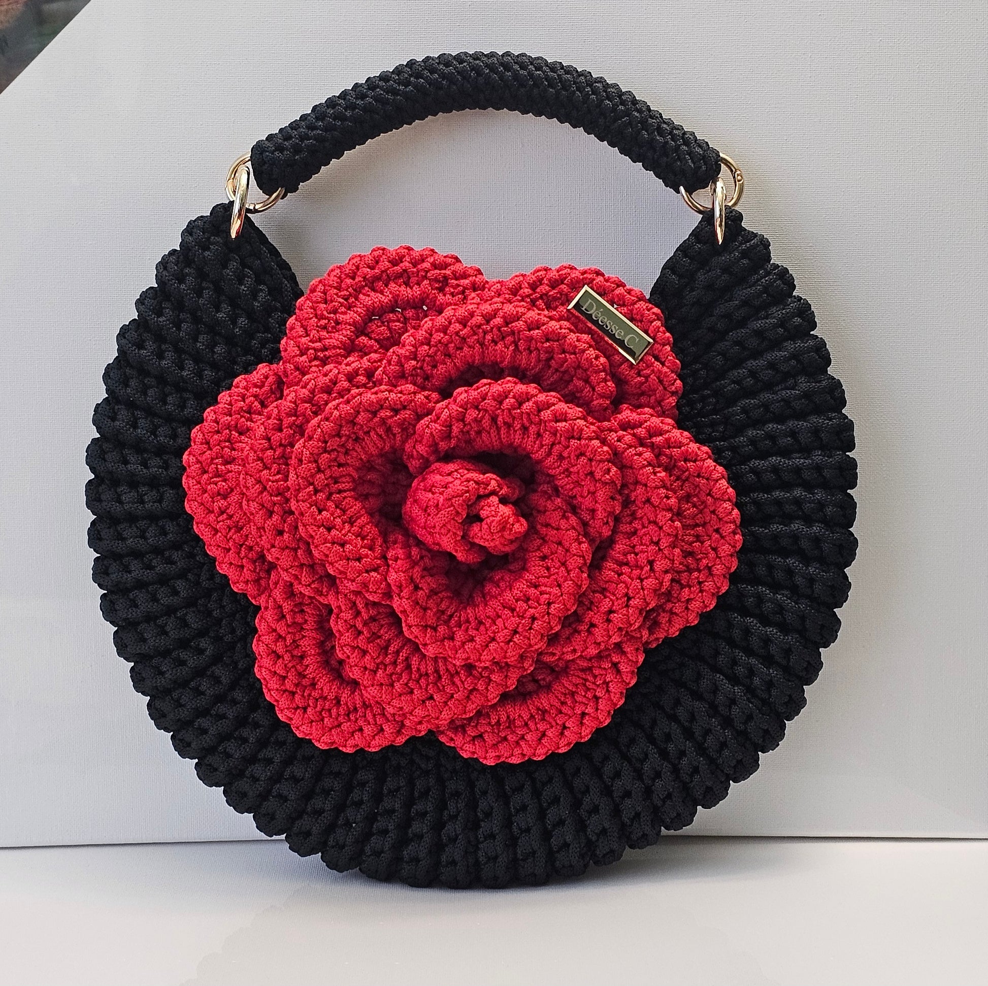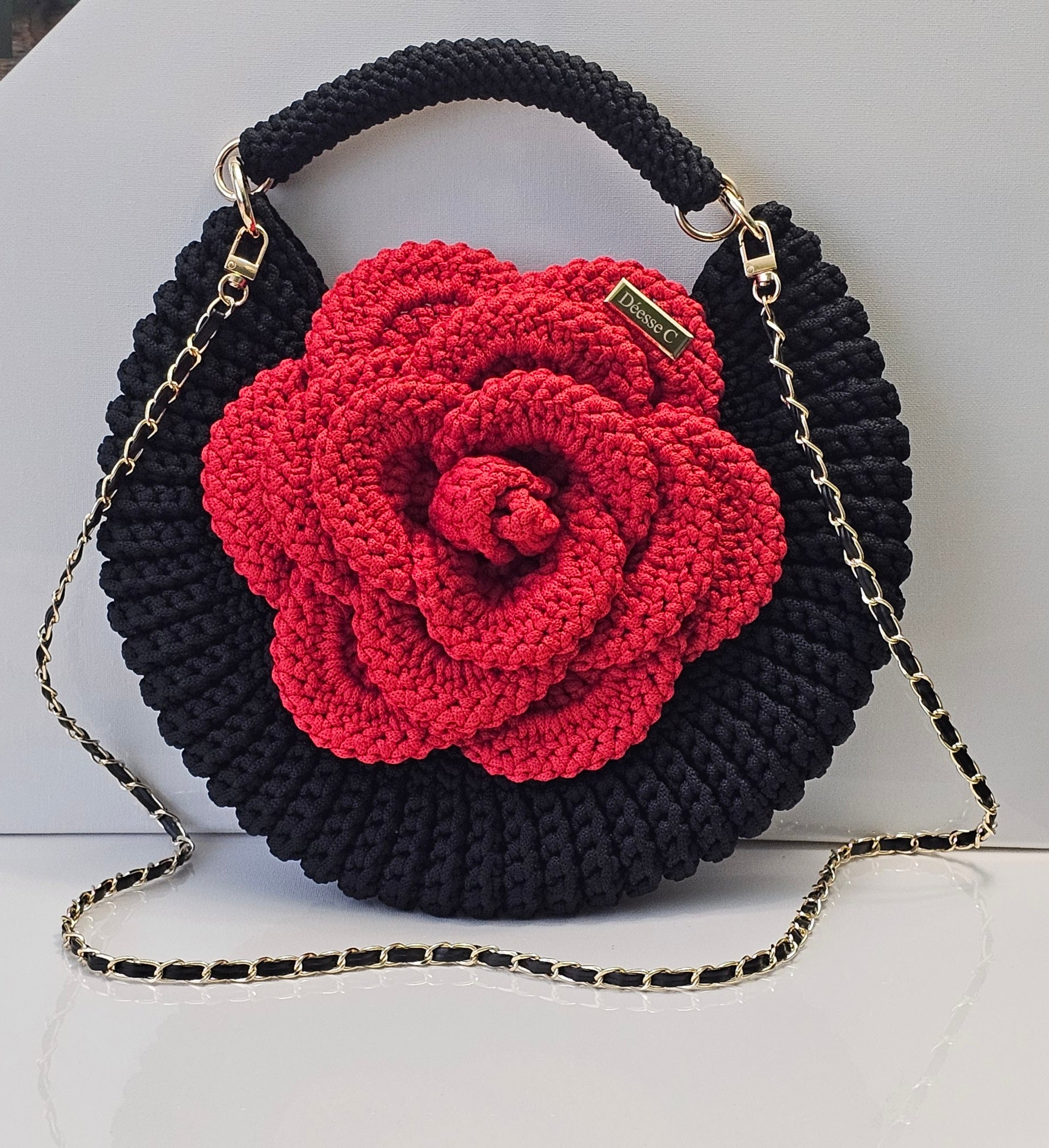 Le modèle Astraéa, est un sac crocheté à la main, façonné en demi-lune et orné d'une rose majestueuse qui en fait sa signature.