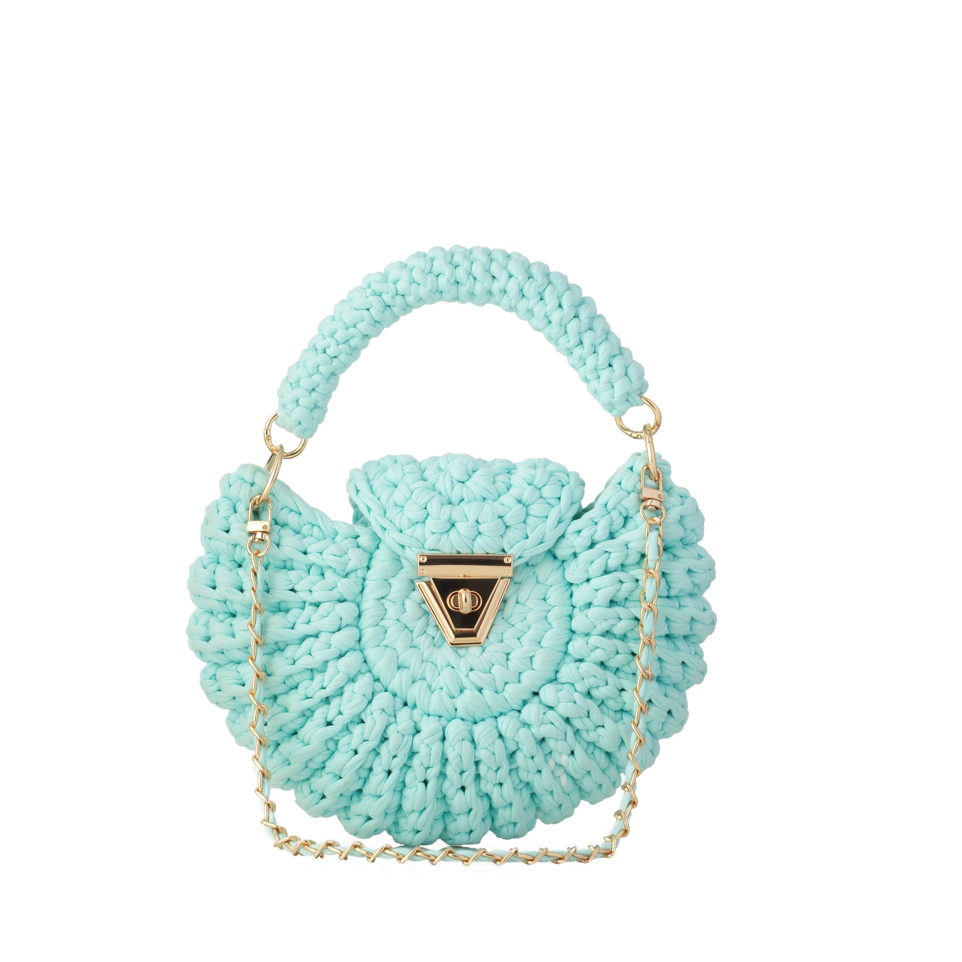 Sac rond, doté d'une poignée et d'une anse de 60 cm en métal doré et tissu assorti.