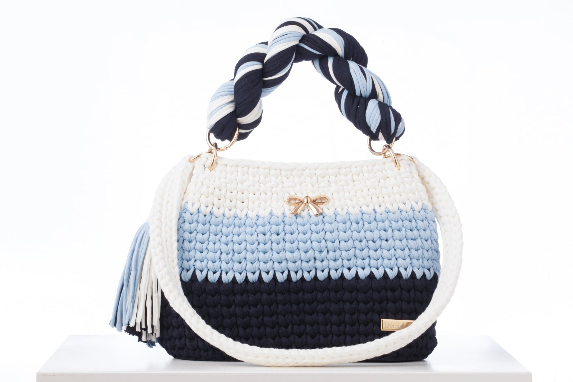 Sac trois couleurs à l'élégance naturelle, sublimé par un bijou (noeud )doré et un pompon.
