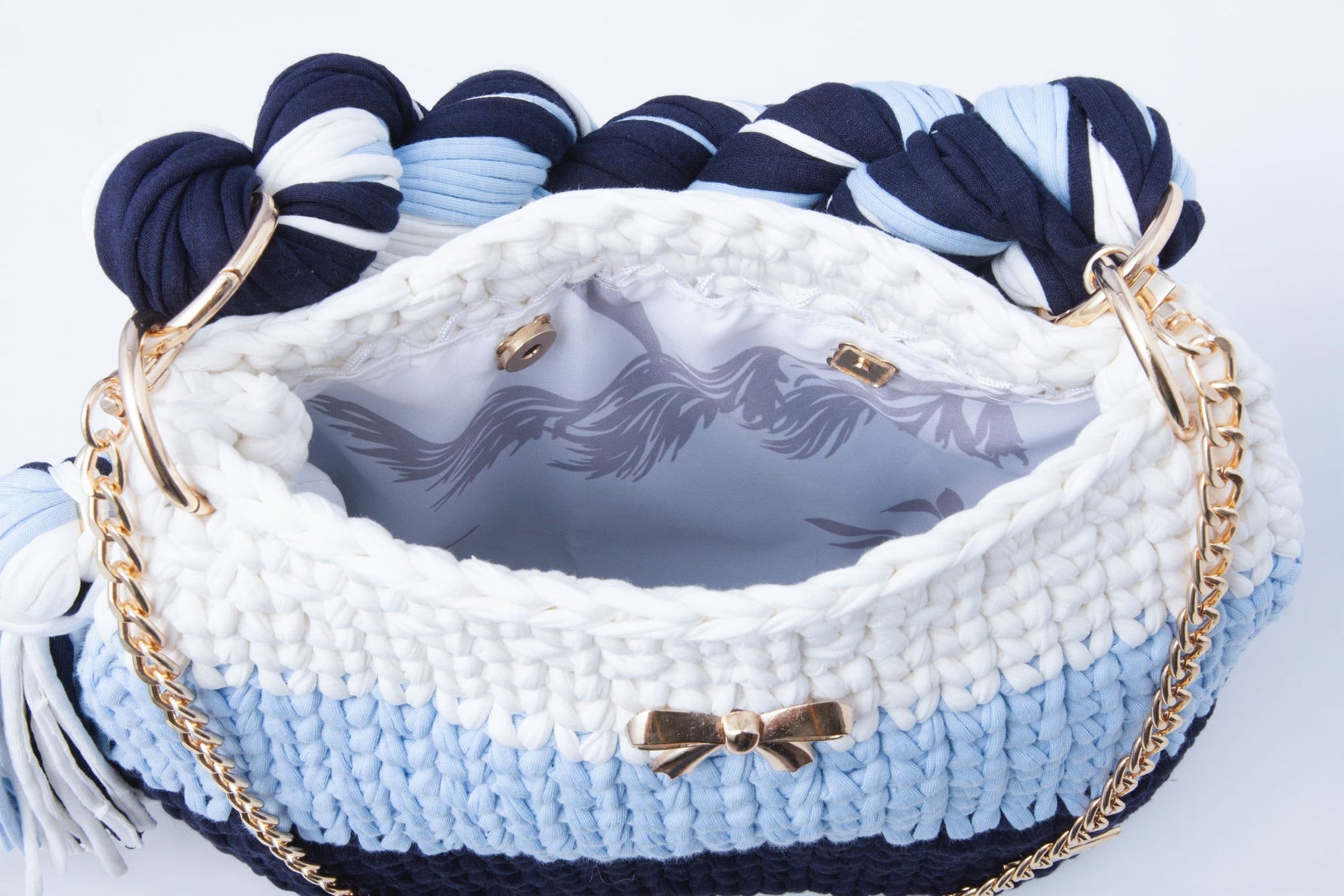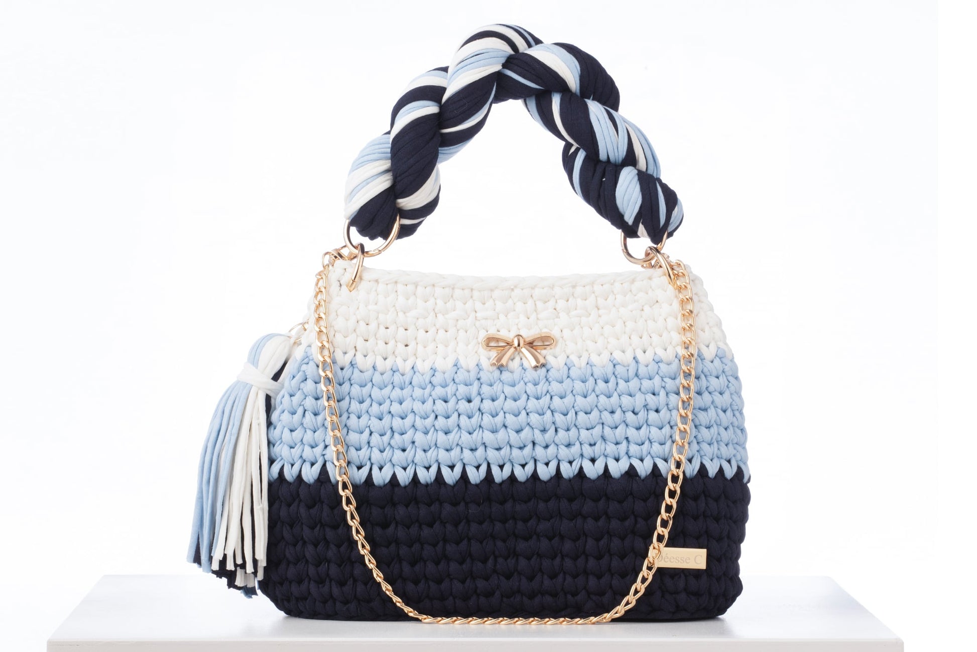 En option, possibilité de commander un anse plate en crochet blanc (80 cm) ou une chainette dorée (80 cm) pour varier les styles selon vos envies