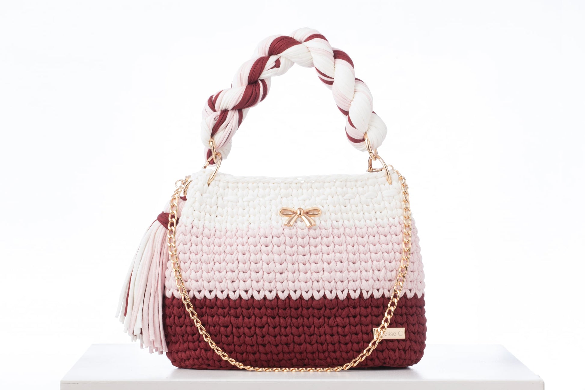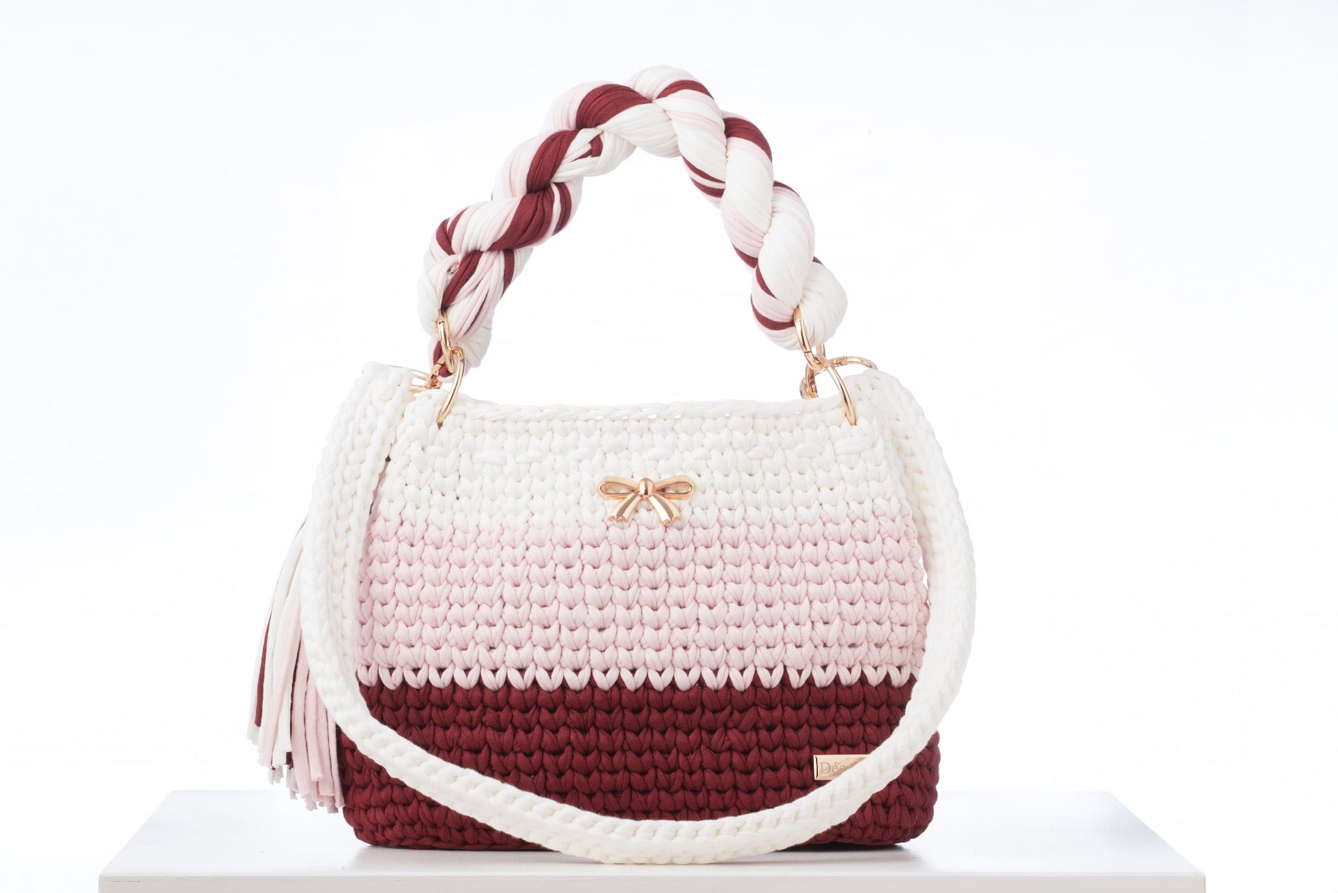 Sac trois couleurs à l'élégance naturelle, sublimé par un bijou (noeud )doré et un pompon.