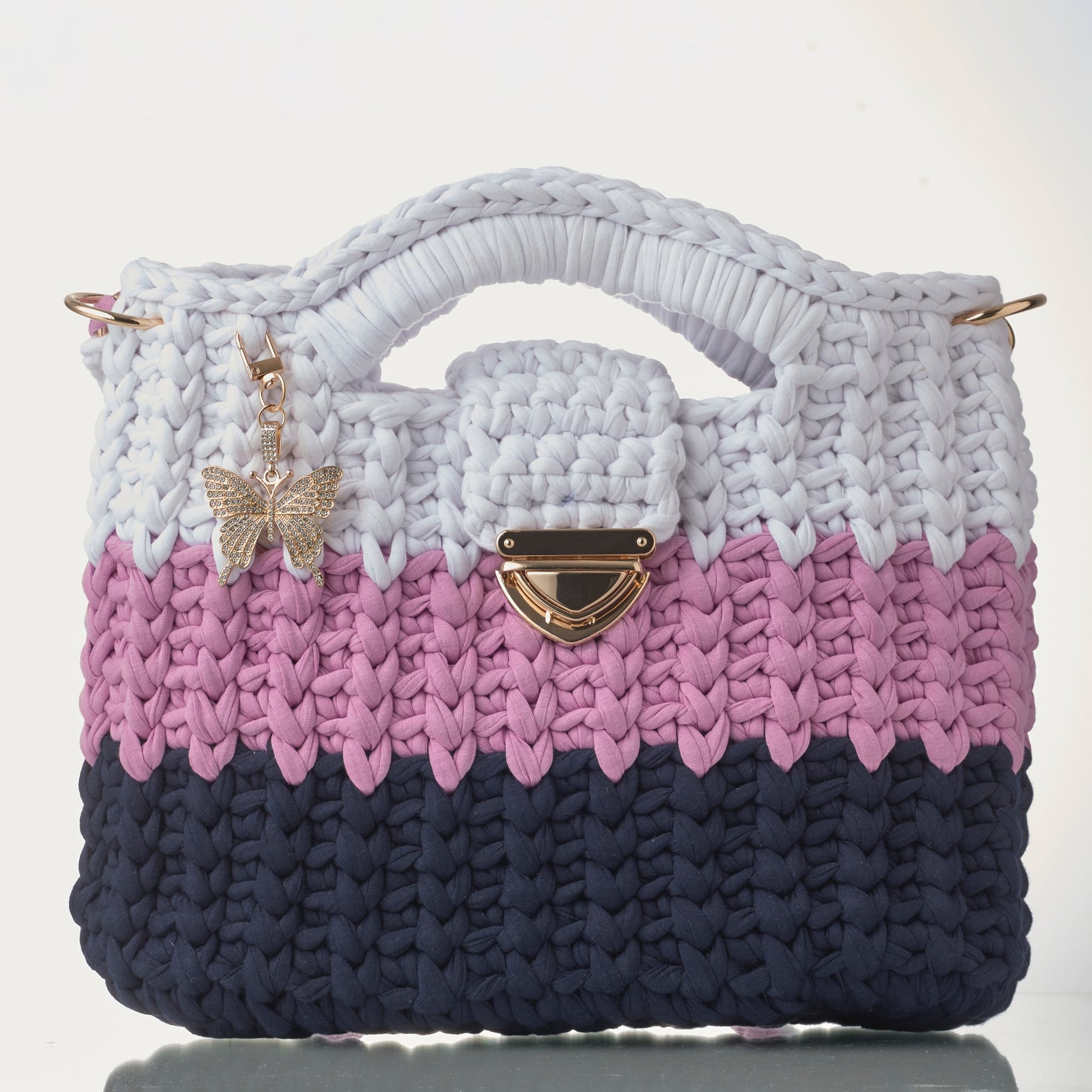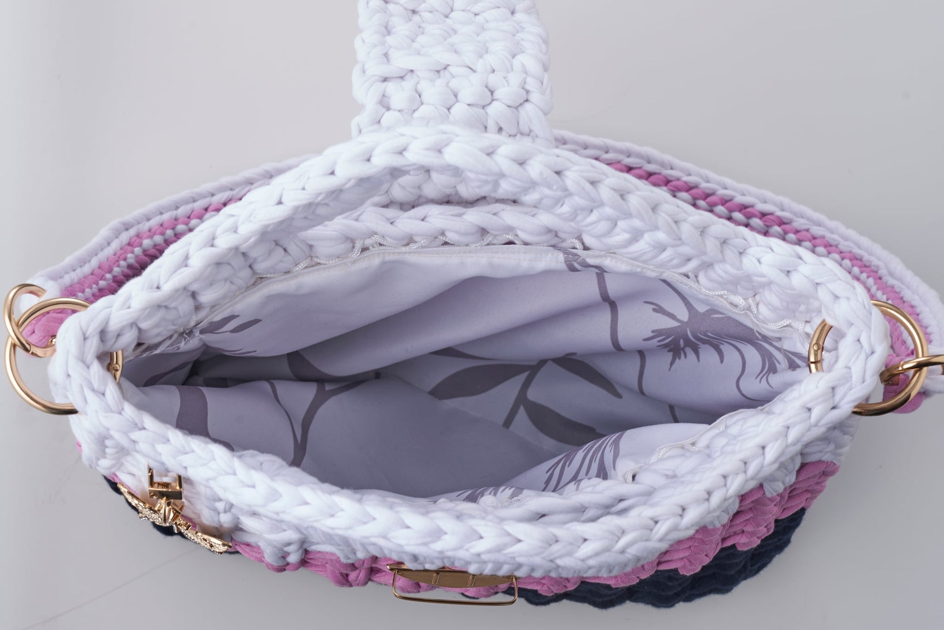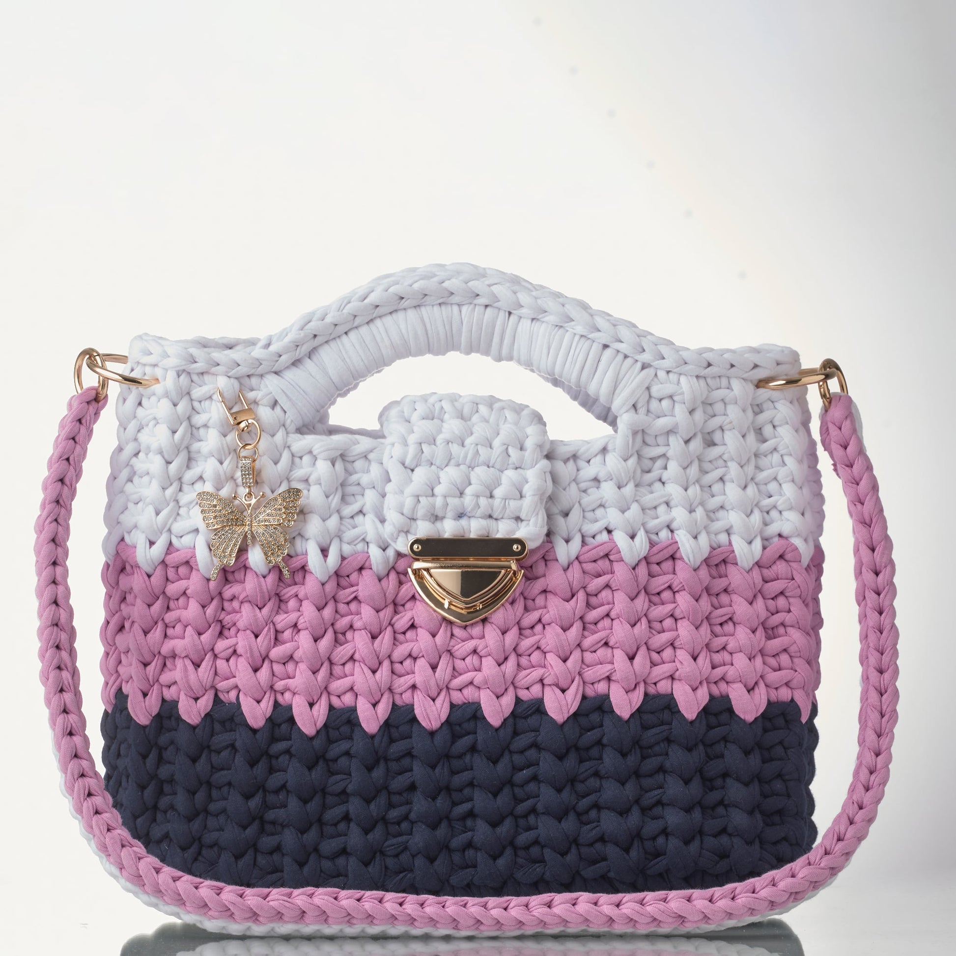 Sa forme élégante se décline en harmonieux jeux de couleurs, réhaussés par une anse crochetée blanche qui lui confère charme et délicatesse.