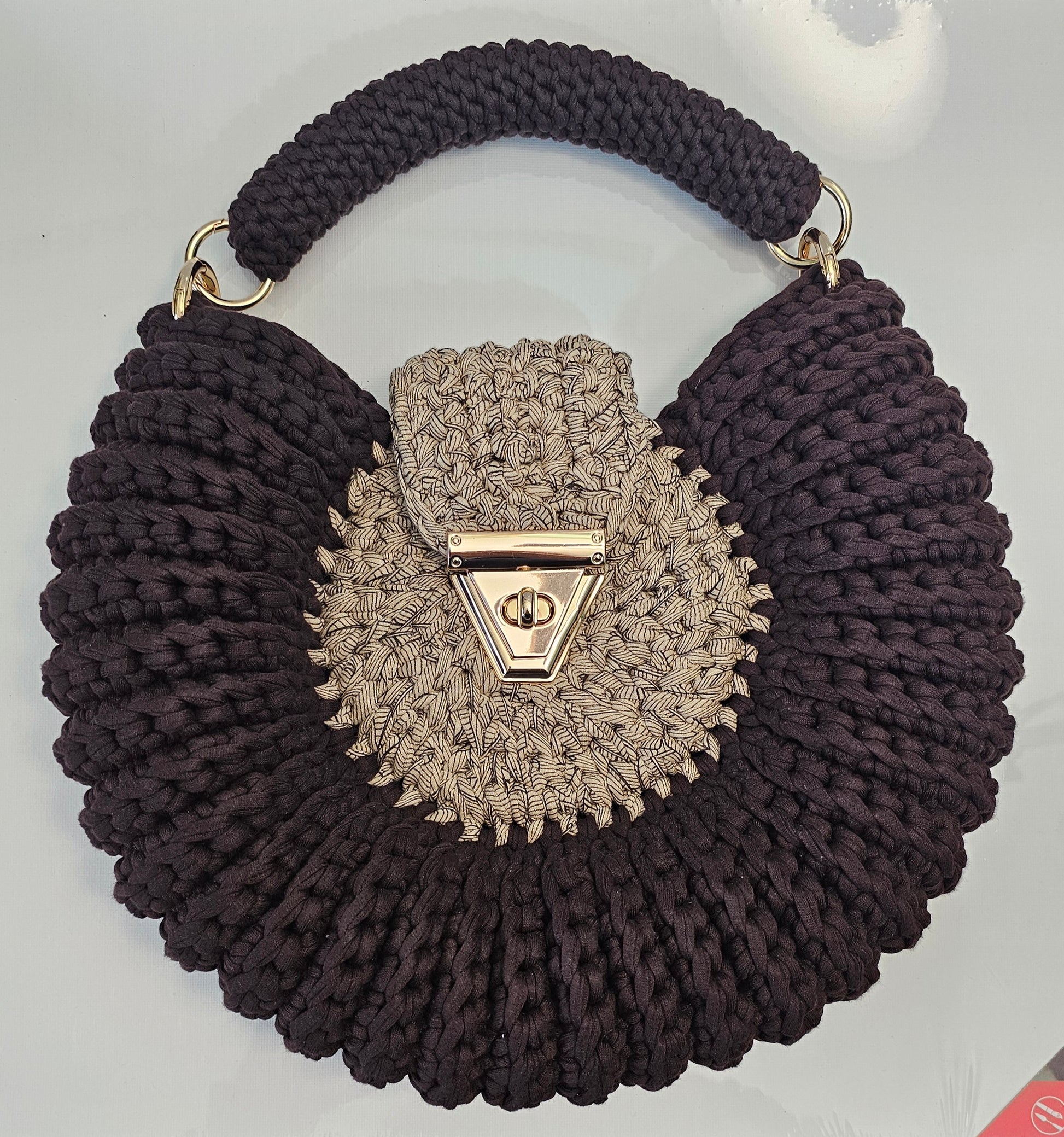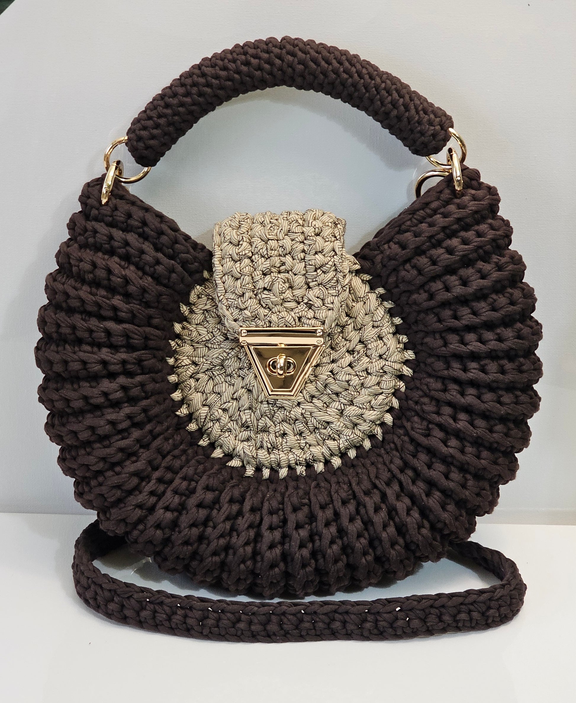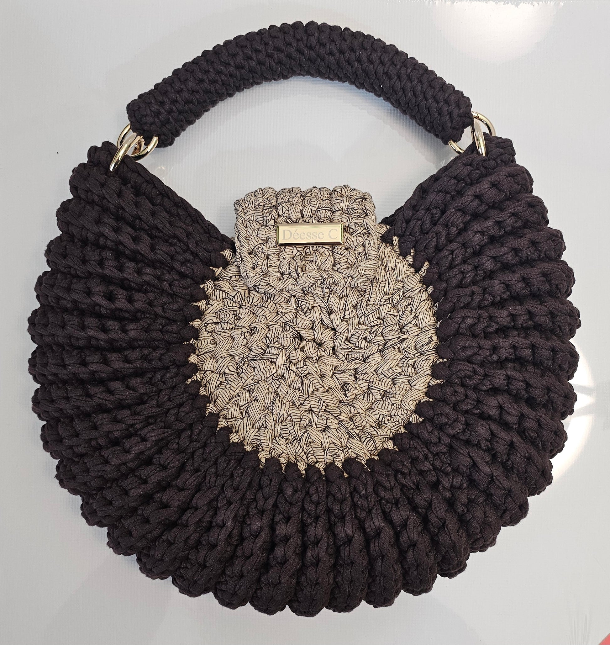 Crocheté à la main en un magnifique brun il dévoile en son coeur un motif bambou, mêlant une alliance sobre et élégante.